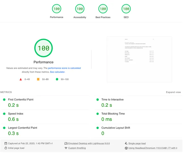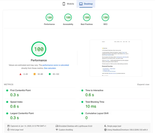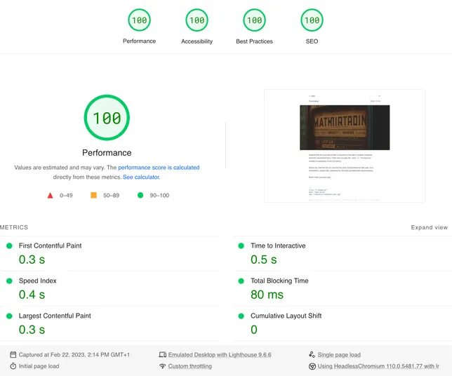 With Astro, Astro Image and Plaiceholder, we top that. Turns out a black-and-white website with little to no content is pretty fast. May not be much to celebrate, but getting a FCP under one second, and 4x100 scores on web.dev/measure makes me smile a bit.