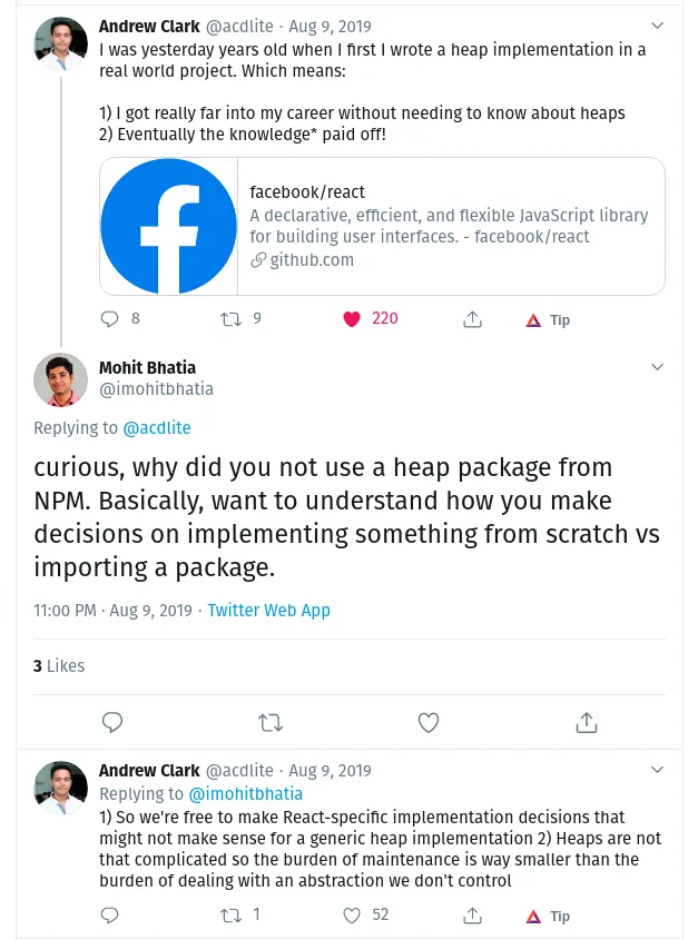 React contains a purpose-built min heap implementation.